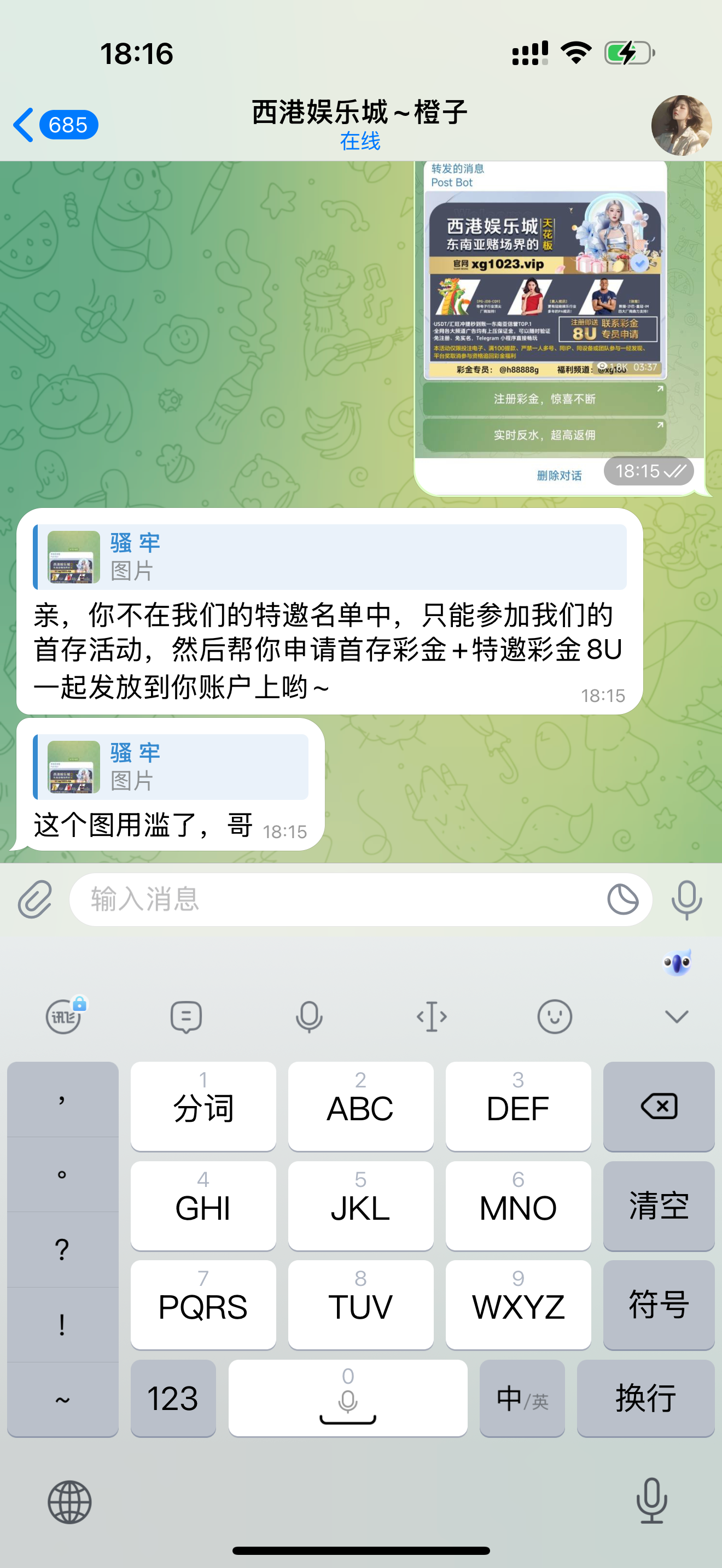 有tg的看看有没有这条机器人消息,没有的拿截图去看看能不能碰到