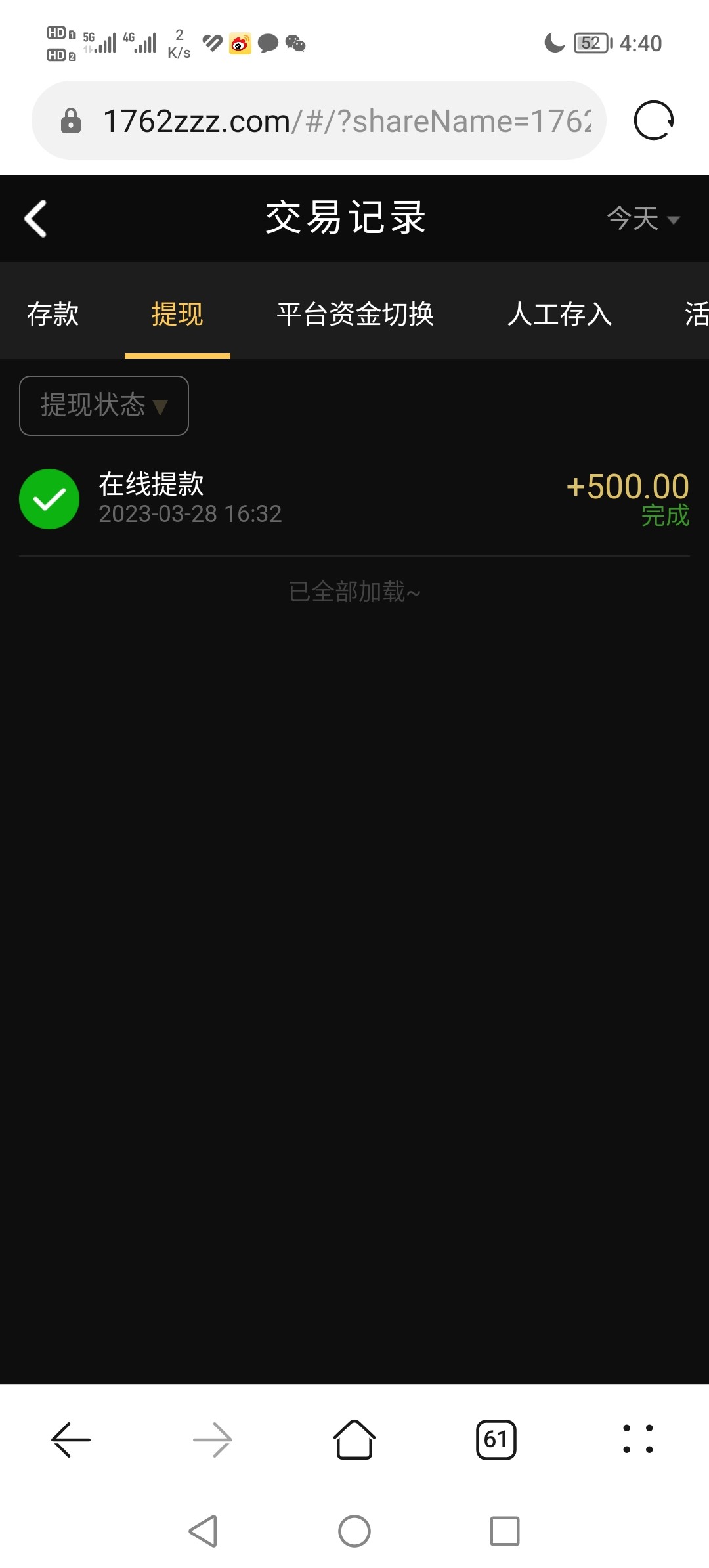 应该是只能提500 提600+拒绝了 提500秒了 多出来的余额他退回了 我又充值了50又提300 把前天9192黑款的钱打回来了