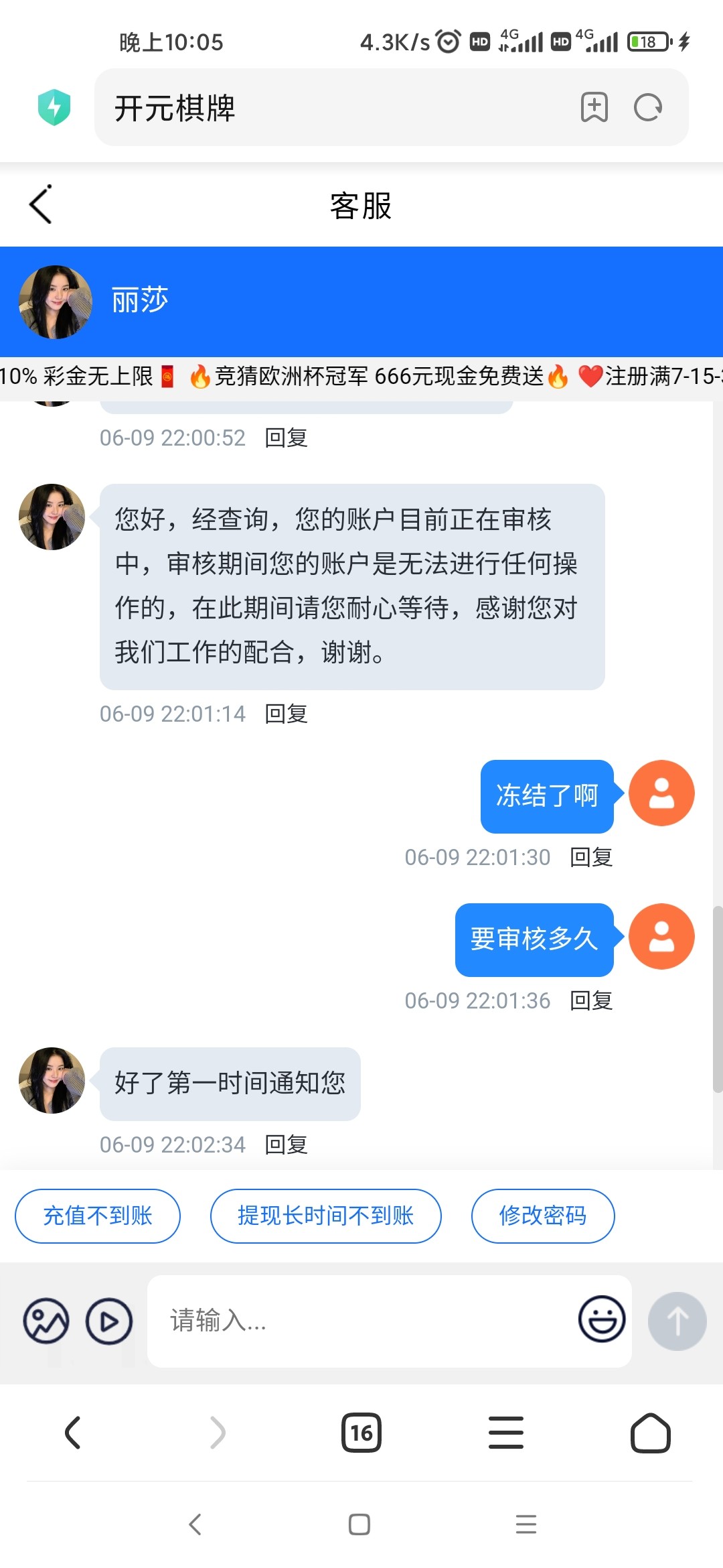 我昨天冲100到账直接冻结,在群里说了