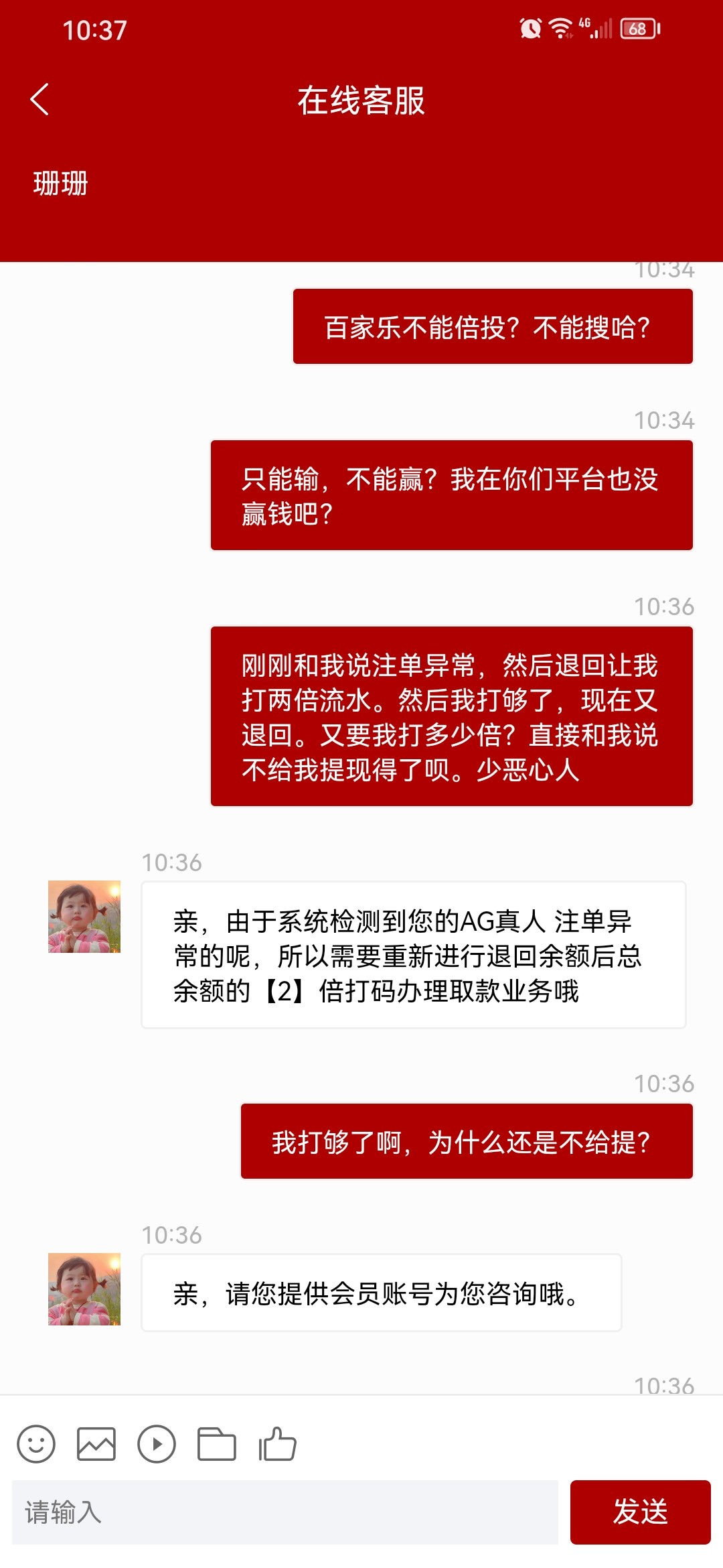 今天和以前一样打AG不给出款,说注单异常,罚2倍流水