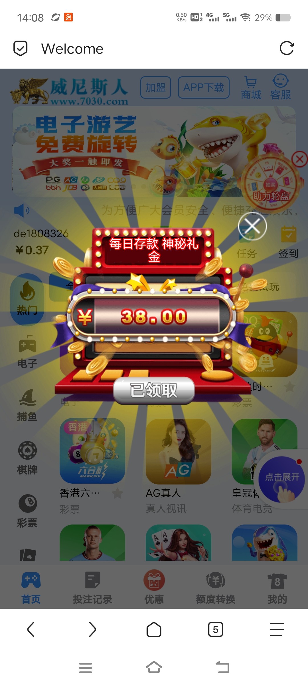 历史累积充值过一千的去看看,有就有,没有有,别骂人,登录会跳出来神秘彩金领取…我领了38打彩票打出来了521后面充值500去参加500送128挂了玩了个寂寞…同类还有太阳城,匍竟知道评论区留网址,我之前匍竟也充值不少不知道网址了