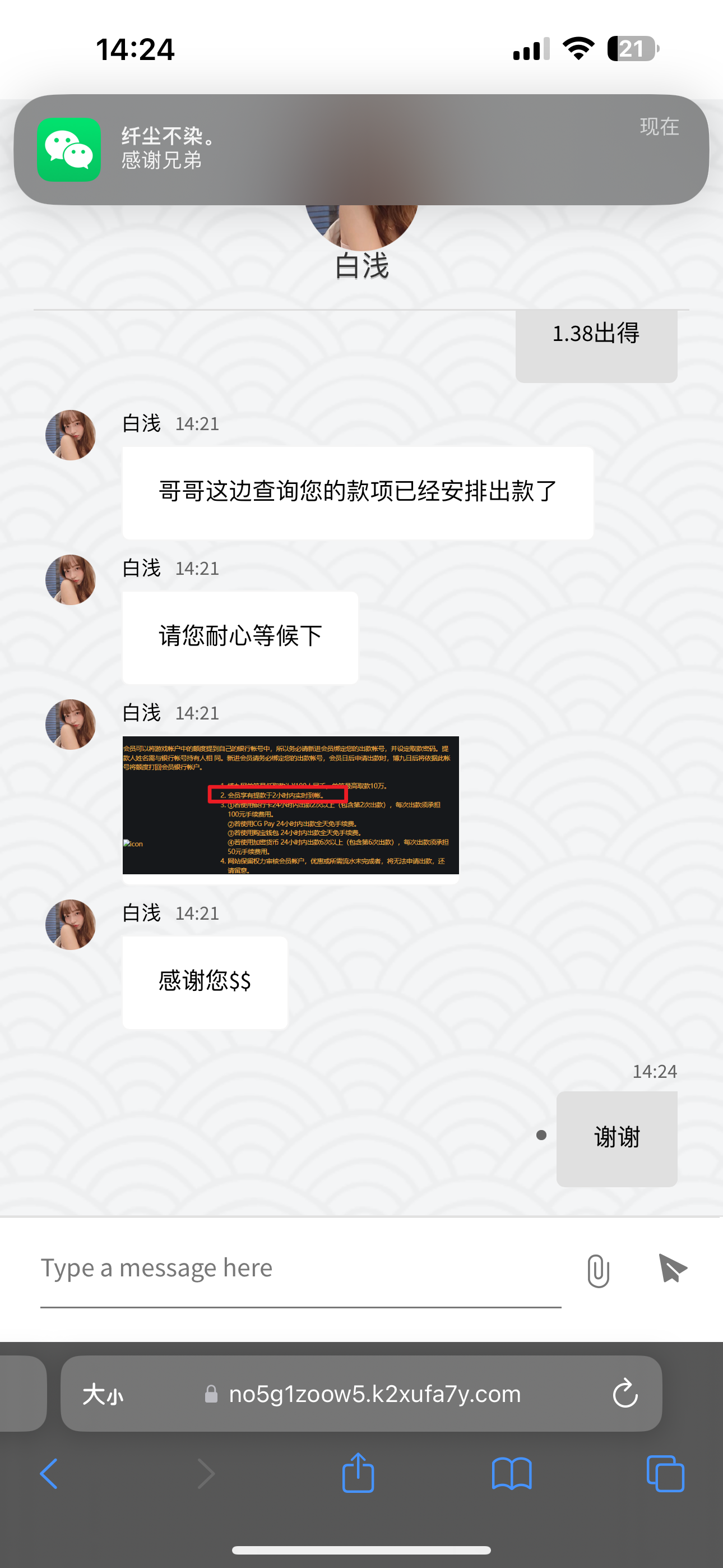 188送188,彩金六杯水,本金1水一共1316流水,不限制游戏。我玩了会电子就去白家哭了。一个号提了500,一个提了335,提款提银行卡和购钱包。优惠有写,下面申请流程,先注册好账号,问客服188送188如何申请,客服会问你是如何知道的网址,你就说朋友告诉的,他会问你朋友账号多少,老哥们可以报我的,因为我参加过了,看上面图片就行。我之前也是报朋友账号,他会查询,并且你还没申请,还未存款的情况下时候有可能就让你提交手持,也可能在你出款的时候让你提交,介意的可以不玩。你如果提交了手持后和Qq,他会安排专员加你Qq,你存款完他就给你送了。另外提款的时候10分钟没到账,就去问客服取款多久到账,他会让你提交手机,银行卡号,钱包地址,姓名,Qq邮箱,会给你邮箱发个验证码,收到后提交给他,1分钟秒下款。说了那么多,希望撸出来的老哥发个牛子或猪脚饭,不发也无妨,一旦发出来必定人多去撸,可以在不同时间去参加,别一股脑全冲进去。有多名字的直接可以去对打白家哭。