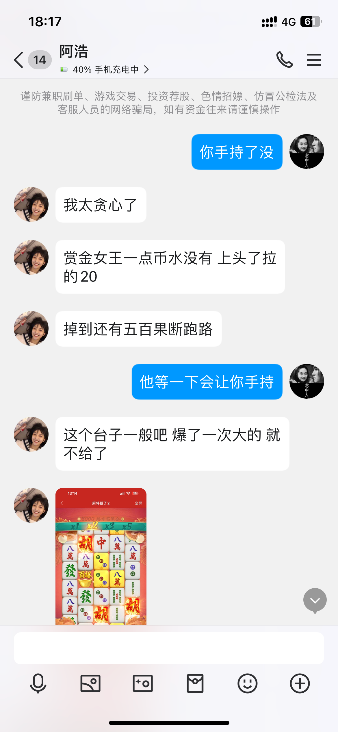 我冲了楼主到账给你射猪脚饭 我冲了188 彩金两个小时才送你不说清楚 我进去就买pp糖果排队 输的还有100 直接两块钱梭哈麻将2 爆了四百多 我又去玩女王 没水  一直掉分 大盗一般 两块钱麻免费爆了七十块钱 又去玩大对决 1.2一直平拉 真的是大水 贪心了 打到了800没有提 就玩大对决1.2极速拉 麻将1我没去打 这种系列的台子麻将2都有水 我提了五百 到账你把你微信收款码发给我 我给你射猪脚饭 还有188彩金还没有领取 三点钟才到 还可以吧 我不敢贪了 提了就跑了