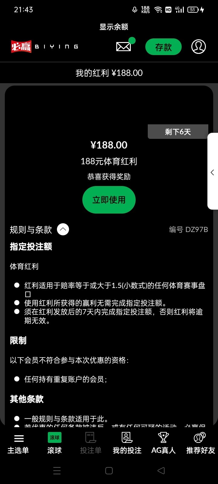 闲着无聊看看邮件看到一个必赢的登入上去有一个转盘转到了188体育红利 由于我不会打 我没打出来 老哥们去碰一碰吧 有就有没有就没有 祝好运(✪▽✪)