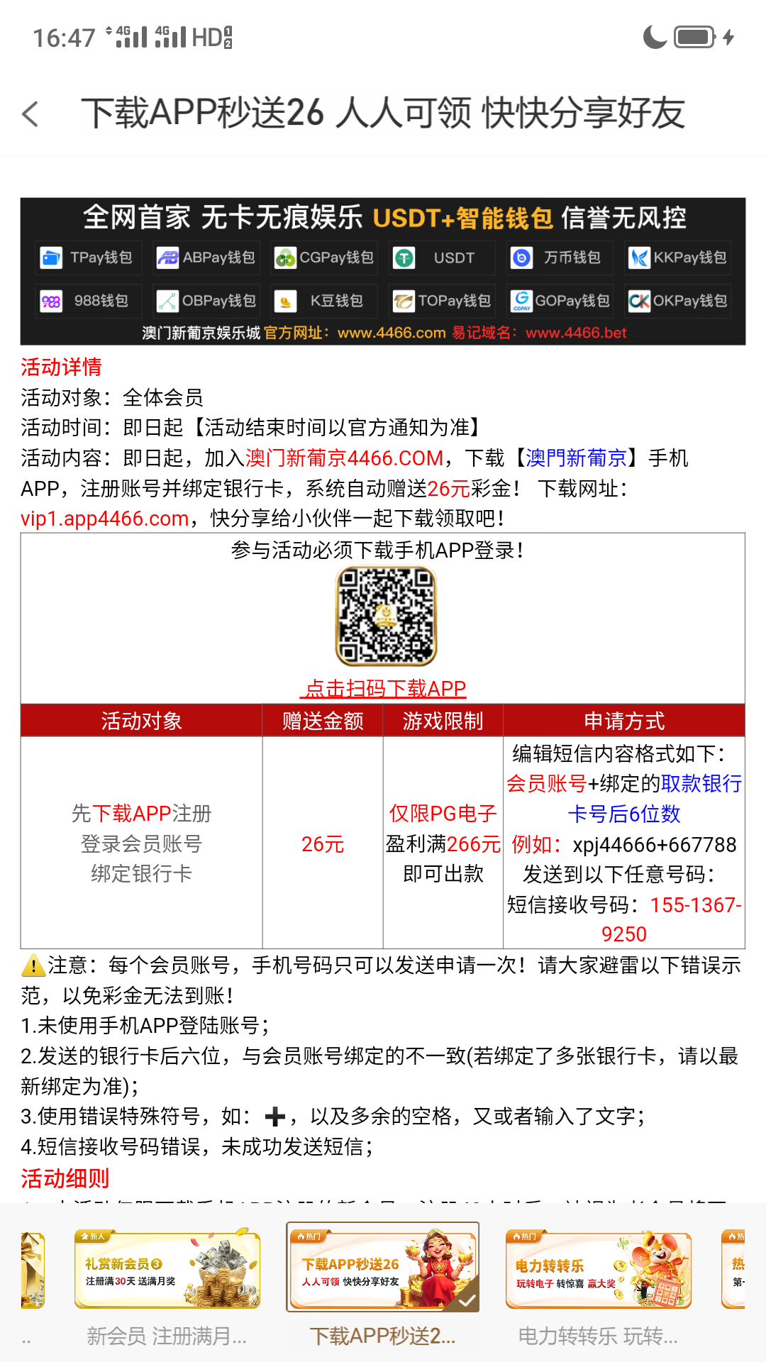 网址4466.com,下载注册绑卡发短信送26,不是秒送,我是发了短信等了20多分钟送的,直接送到余额,最高打到180打死了。