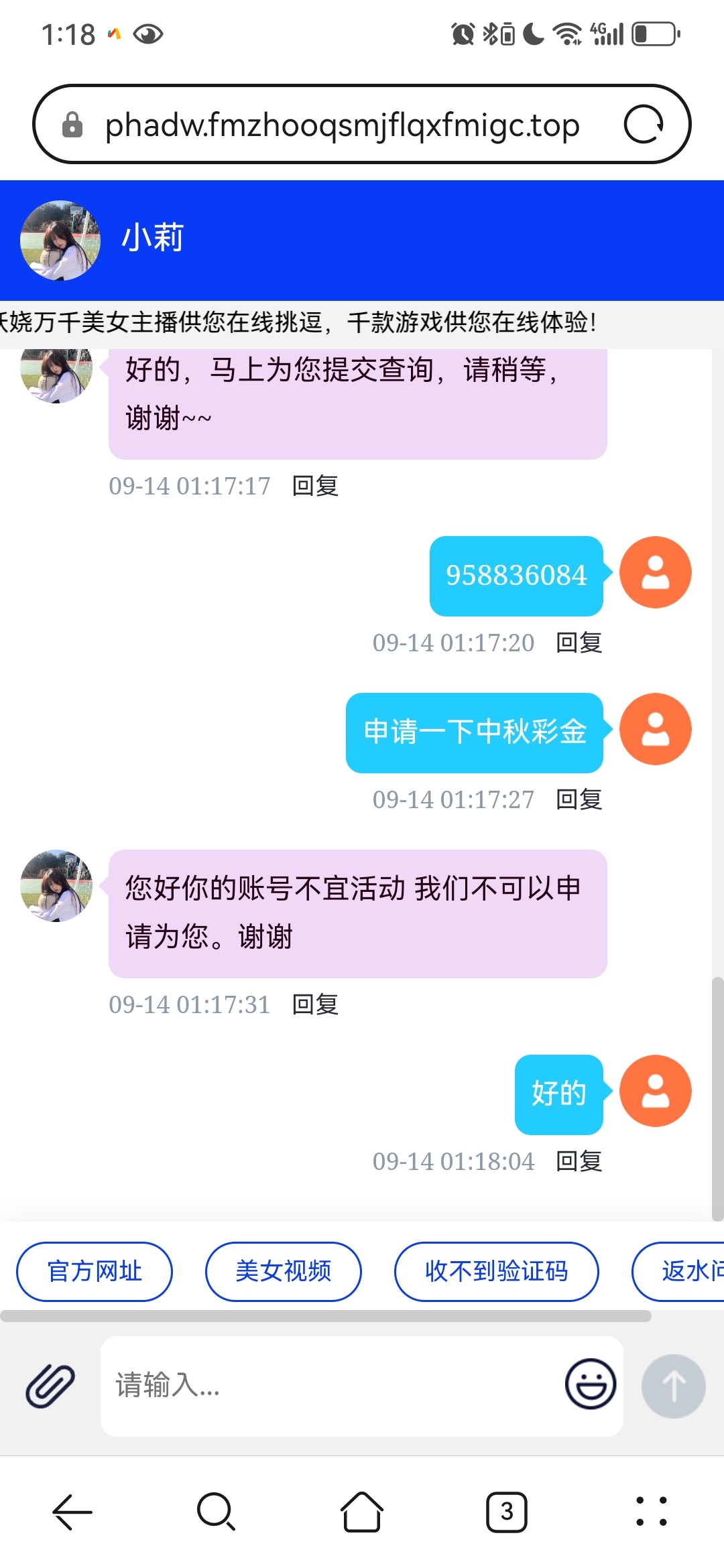 您好,艳池直播中秋佳节活动① , 为反馈新老会员的支持与一路陪伴,值此中秋佳节推出连续4天派发神秘彩金,只要您是艳池直播的会员,在9月10日前历史总存款100+,就有机会在9月14日00:00至9月17日23:59联系在线客服申请中秋佳节神秘彩金,1倍流水,满100+后即可出款!每个会员仅可领取1次,领取的彩金金额以我司派发的实际金额为准,祝您多多盈利!生活愉快!