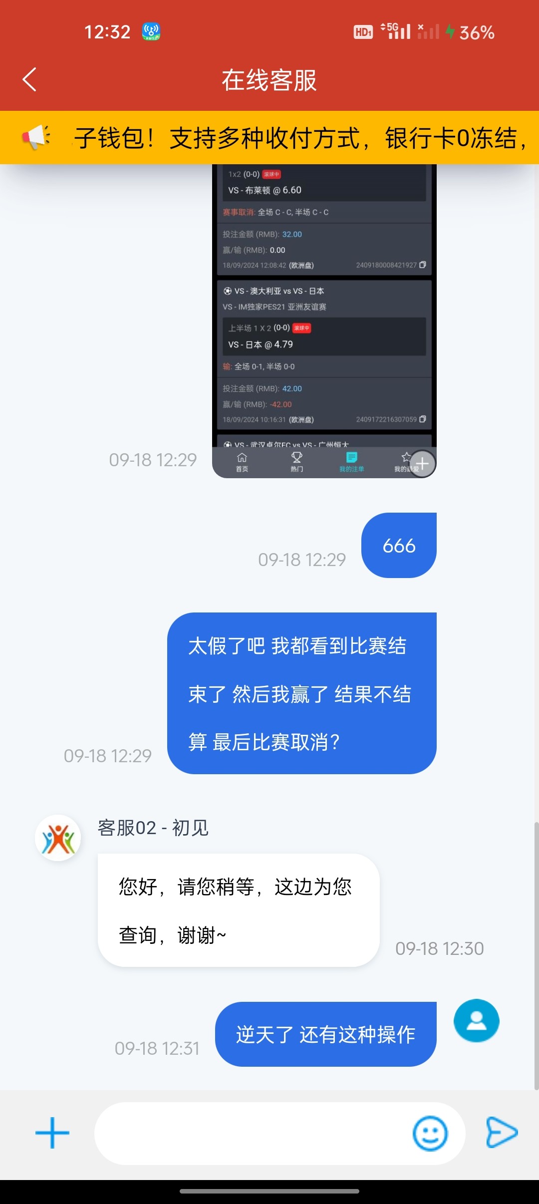 玩IM 体育买了个虚拟比赛 我全程看完 然后我赢了等着结算 然后好几分钟还不结算我就找客服  然后我在看直接显示比赛取消 输的时候就正常结算 赢了就比赛取消真的 6