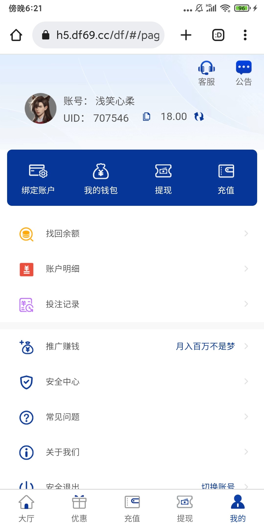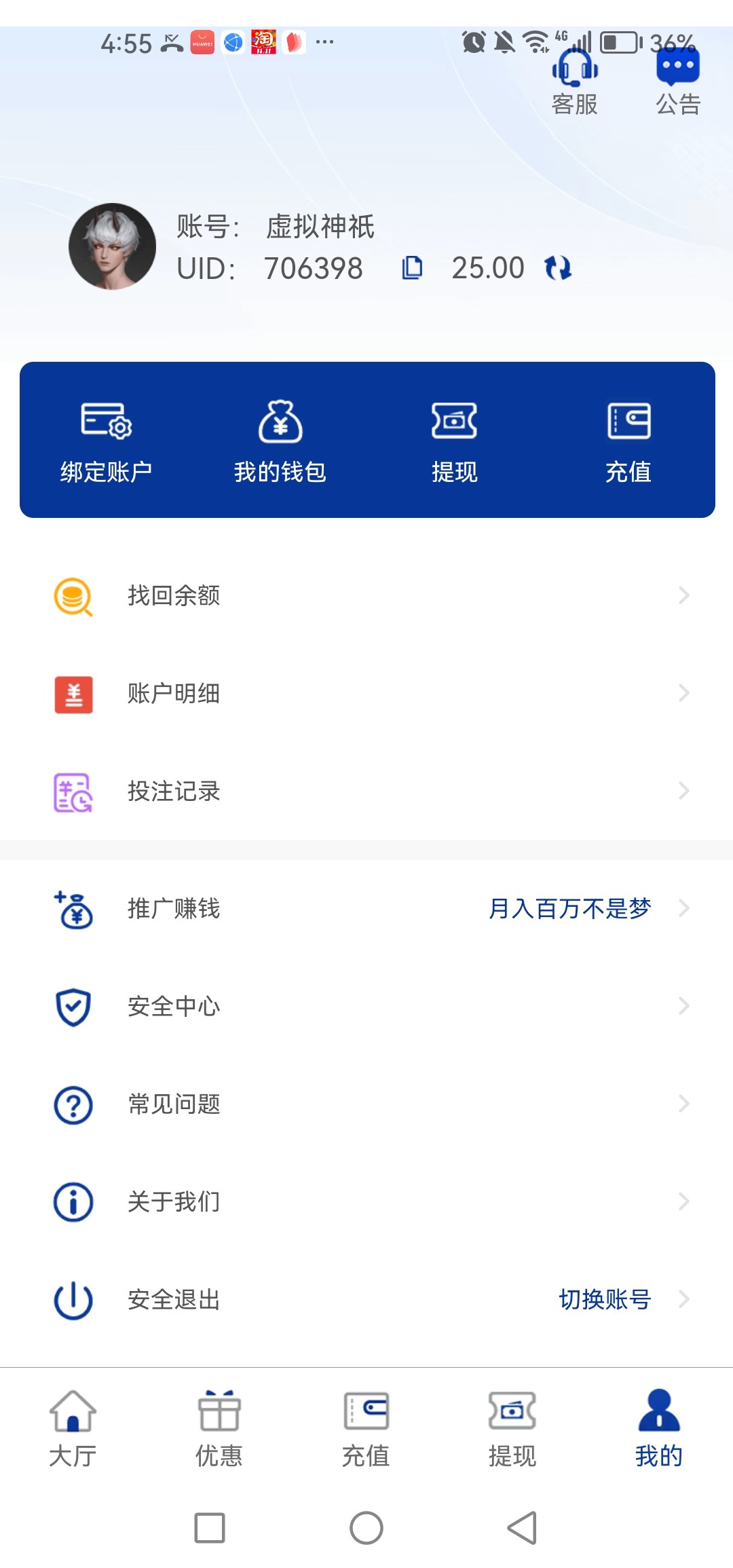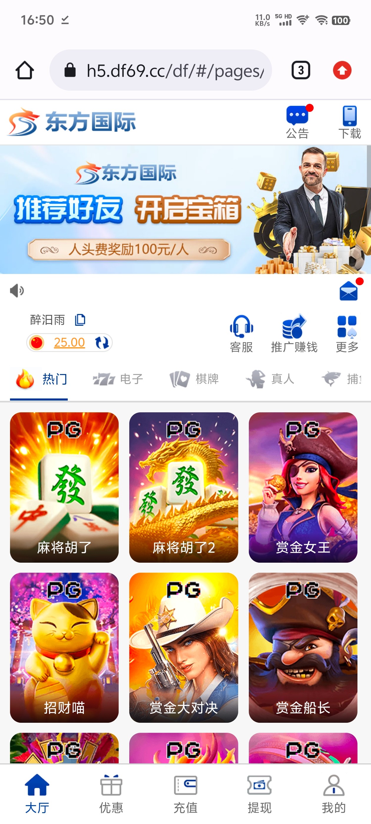 游戏限制PG,PP,FC电子禁止购买免费游戏,充值到账后,请到大厅—优惠页面对应活动(新人存送礼100%或每日存送礼50%)中点击申请按钮,申请成功后2-5分钟到邮件中领取,再到大厅—我的—我的钱包中取出。