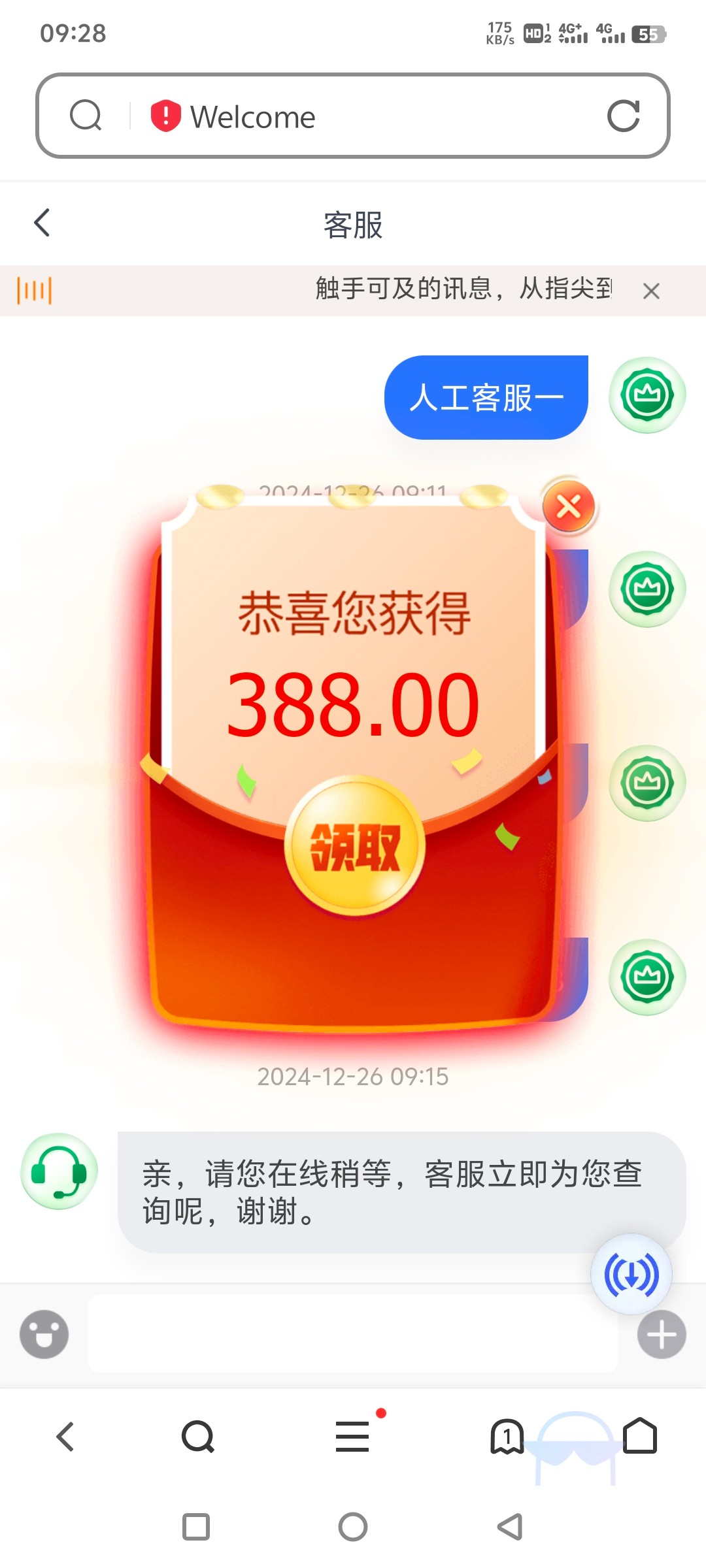 kiss3661597 两天前叫28号来申请,今天换了两个客服都说要充值100,充完后说不在名单准备裸打了首页弹出红包,提现十分钟左右到账白嫖450