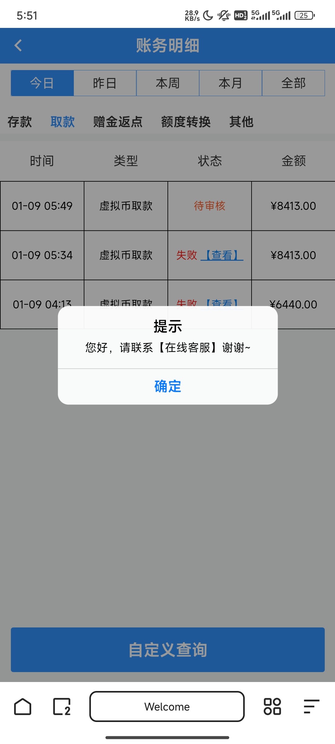 还有一次同平台别的代理加错我了  问我账号 发送给他查询  他直接回复  红了1.4w ?真牛逼                然后我就知道在小蓝台能提走这些 没有被黑  已经万幸  况且我爷不想提那么多 都是提现失败请继续打流水  外加忽悠代理 才出的   打开提现列表 失败次数比成功的多