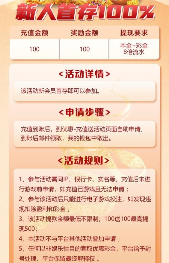 新用户首存100+100(8倍流水最高提款500)