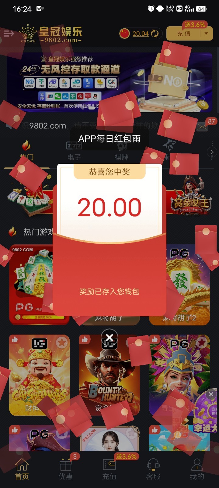100PG今天没打出领了十几块彩金打出380