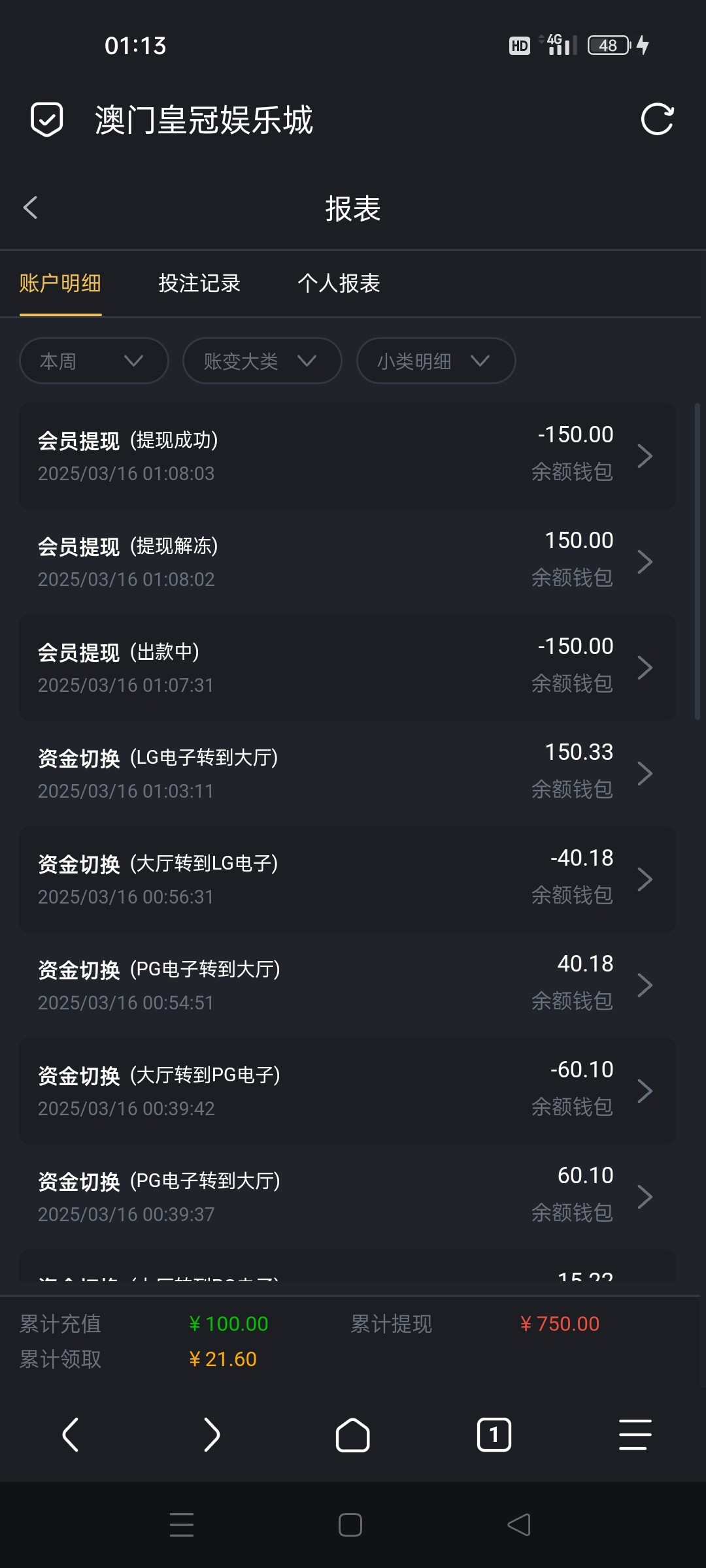 我今天被黑1100 皇冠又卡在450打不出 还好100pg出了800回口血 10块平拉麻2爆了60倍 然后换2块磨完流水
