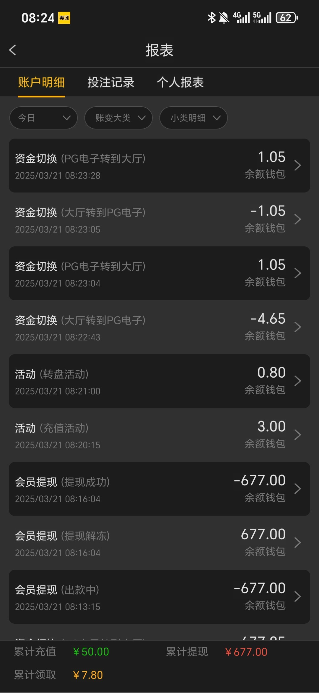 a2650779 充了50出了677,规则有点傻,盈利570,并不是余额够了570就可以提,想玩冲30就可以,50太磨了,