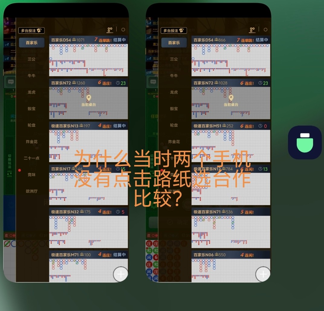 2.为什么两个手机当时没有点击路纸选台做对比?路单上只要有一个对不上,那么后面的路单全部都会对不上。