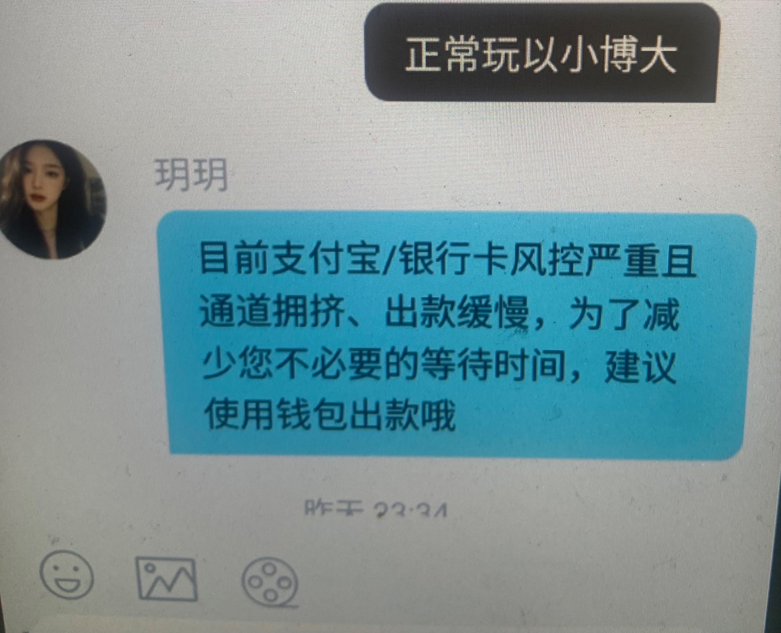 昨晚没事干打了皇冠100➕50以小博大玩LG电子上了1000后提u 因为我上也是用u上的分 一开始跟我说维护 后面又说是要手持然后叫我出钱包或者支付宝 出支付宝他显示说我账号不对一直卡到后面装都不装了直接说我对打 老哥们小心了