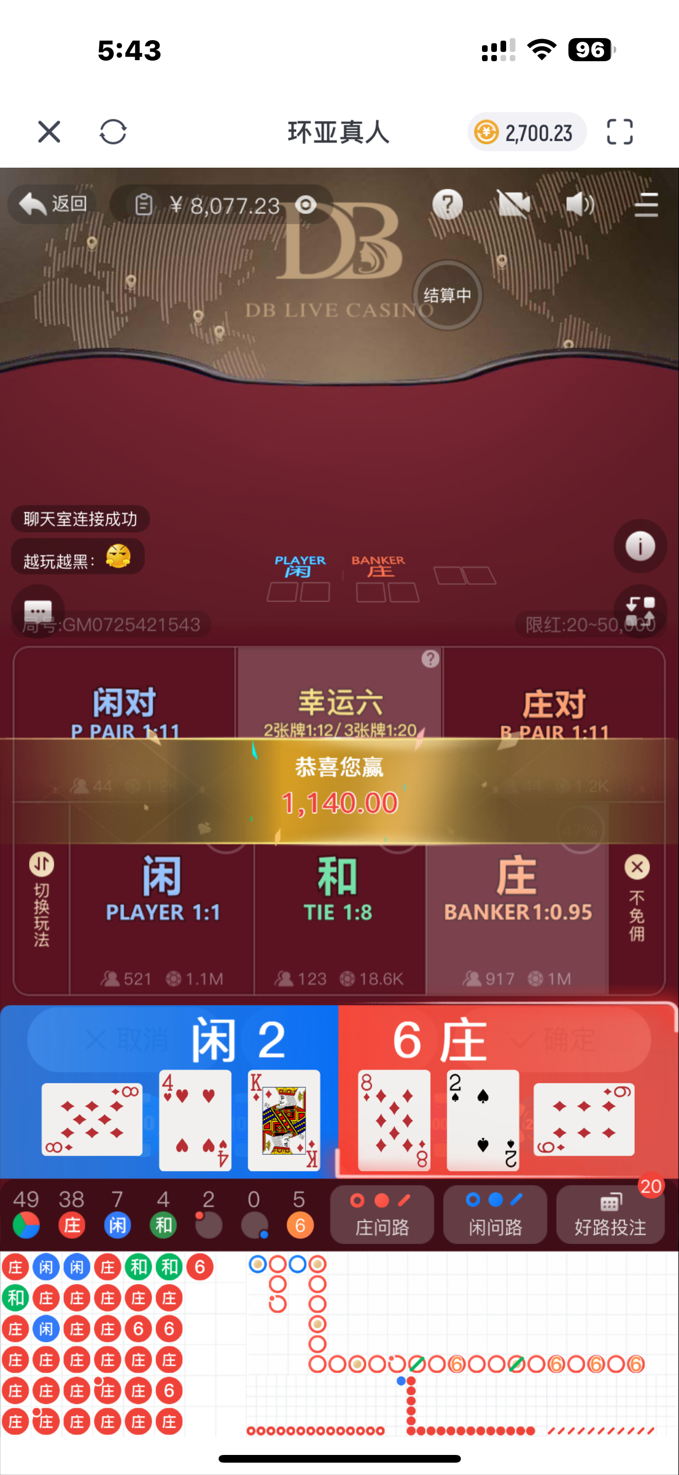 今天玩nba 1500的串子被死妈勇士坑掉 反手送2000给773 下午3000进去百家乐 看见连开18口庄 梭哈了一把 后面胆子小了买了三把刚刚回本 一共22把连庄 给我惊呆了