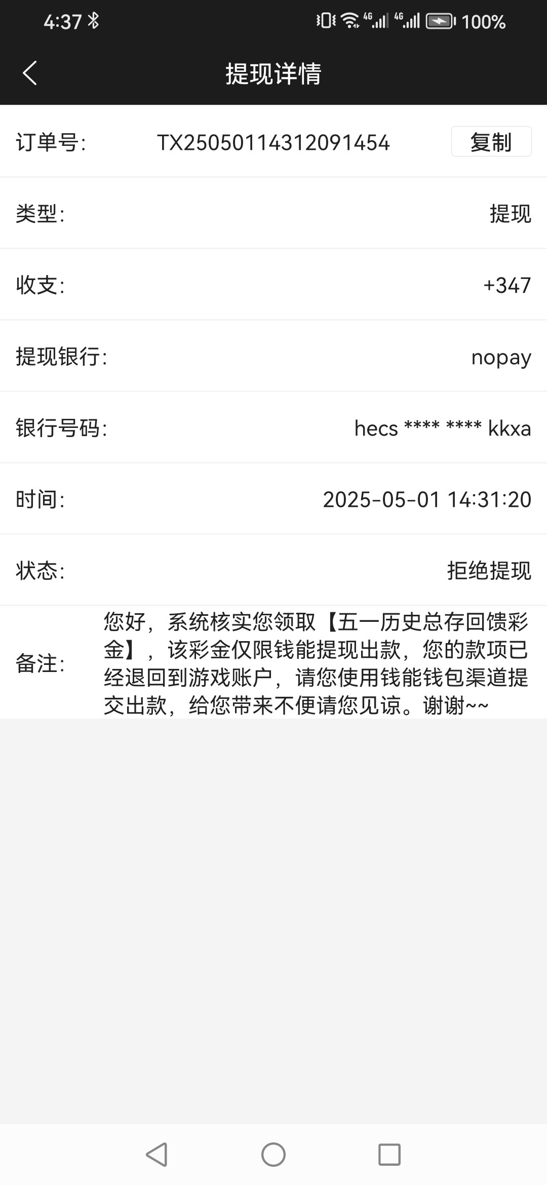 xingchen946 直接找客服说你钱能用不了了,会给你提现其他方式的