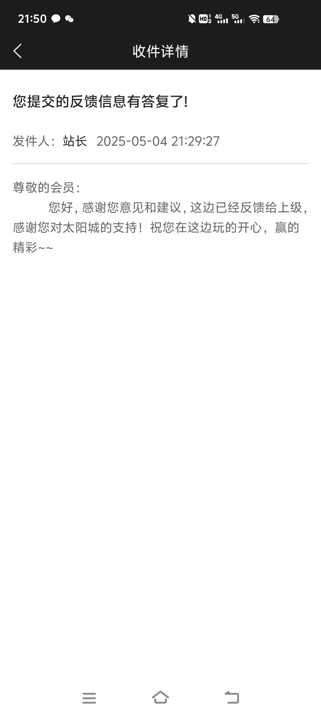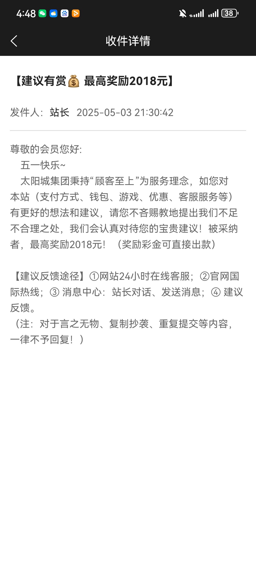 回复我了,这是代表通过等会发彩金了?还是说谢谢惠顾的意思?