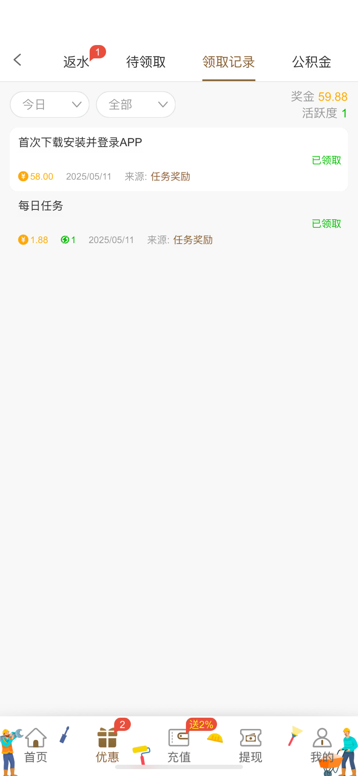 老用户以前积累充值过1000+的现在充值100打一杯水可以下载app领取58彩金,喷狗必中出