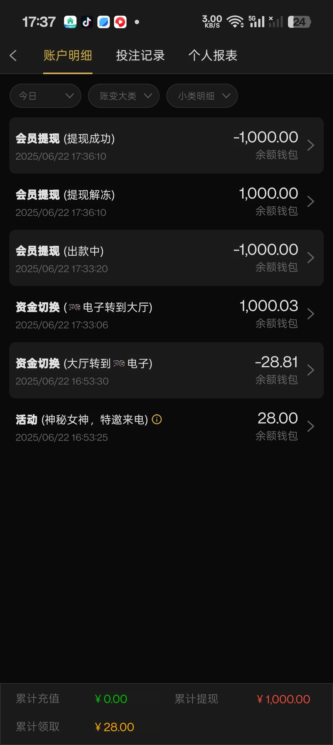 我也去领了28,半小时上1000,不知道给不给提,以前也只冲过100