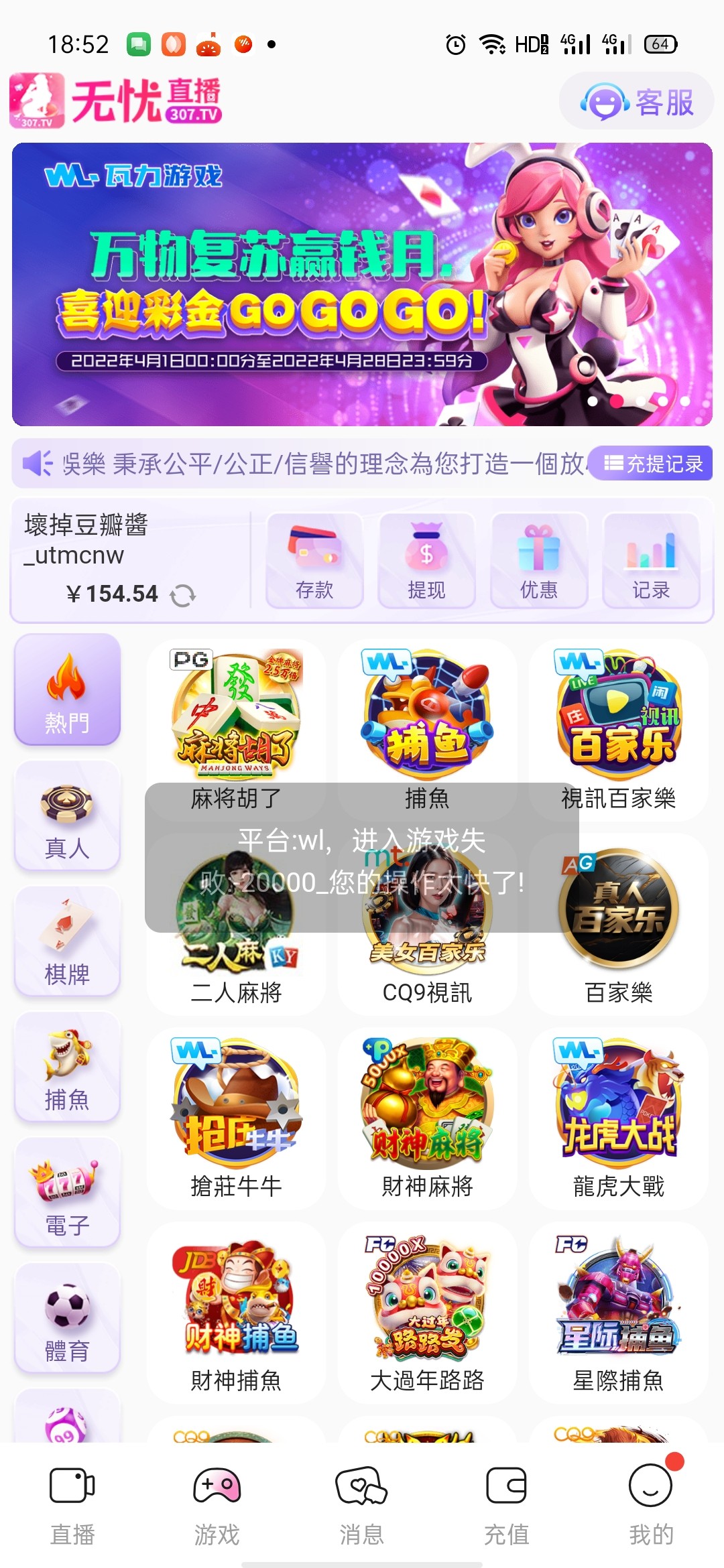 申总 多想想自己的问题傻逼,10个直播平台9个注册送都能出,黑了说明你ip有问题