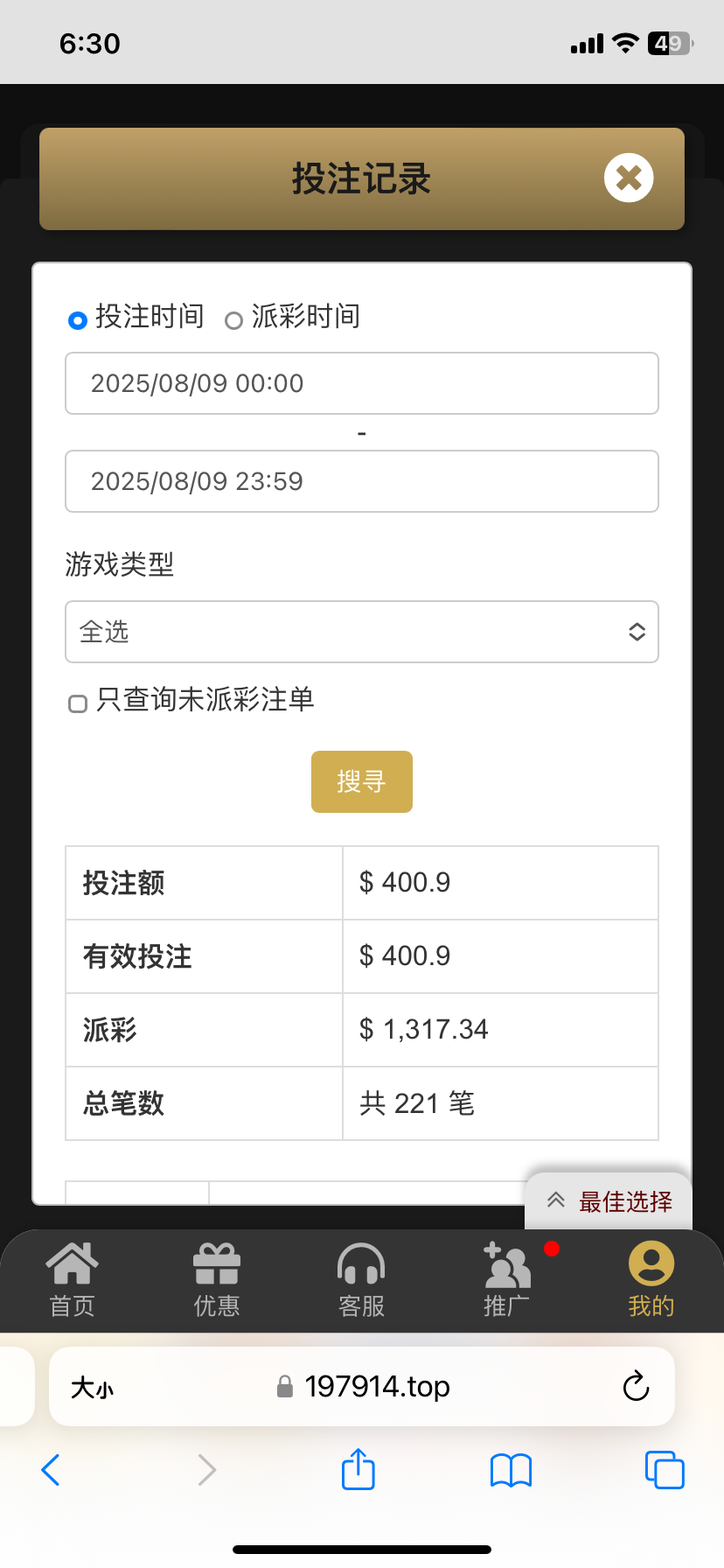 打十几倍流水,肯定一开始是赢的,只不过你嫌少而已!我绝大多数都是不到三倍流水就输光了!