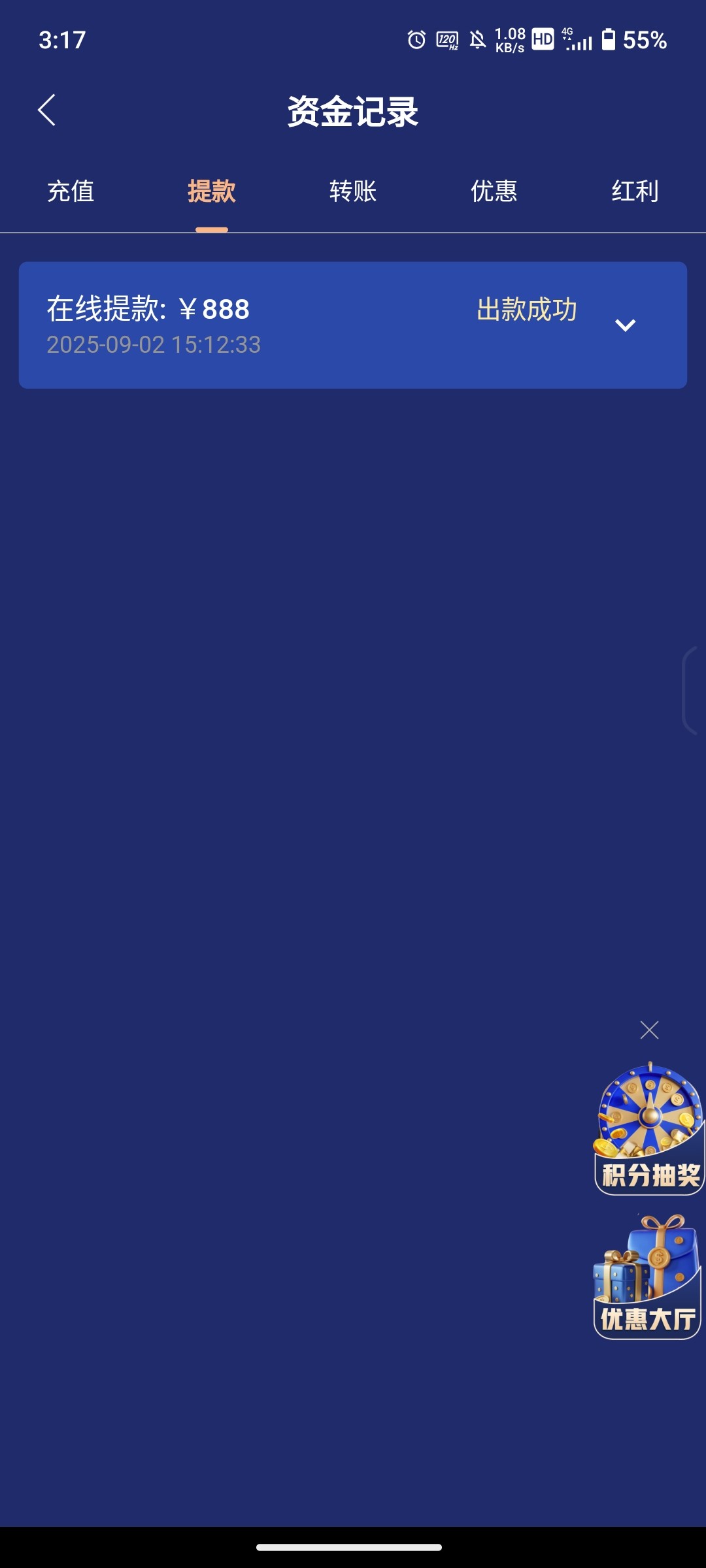 可惜只能提888还要扣手续费哈哈哈到账870