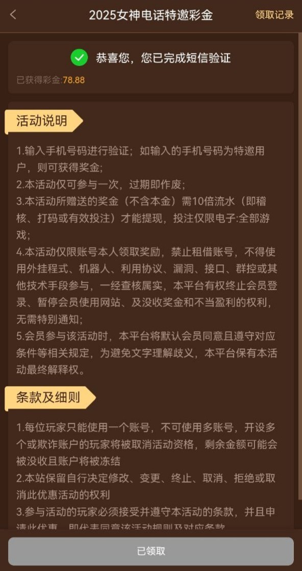 新用户注册自助验证领取短信特邀彩金,有就有没有无视吧,具体自测
