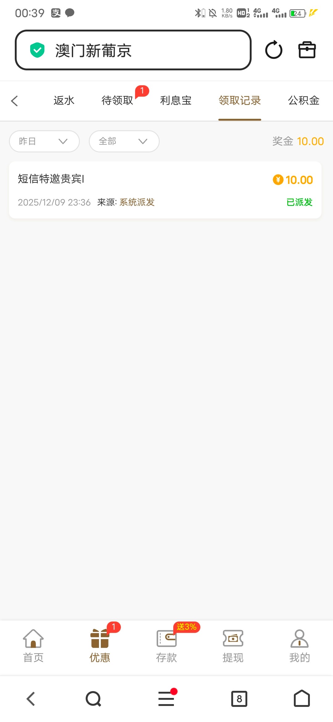 有短信,不知道能不能领,挂壁在大街边上了,沾沾好运让我提一点钱去网吧苟活一晚吧