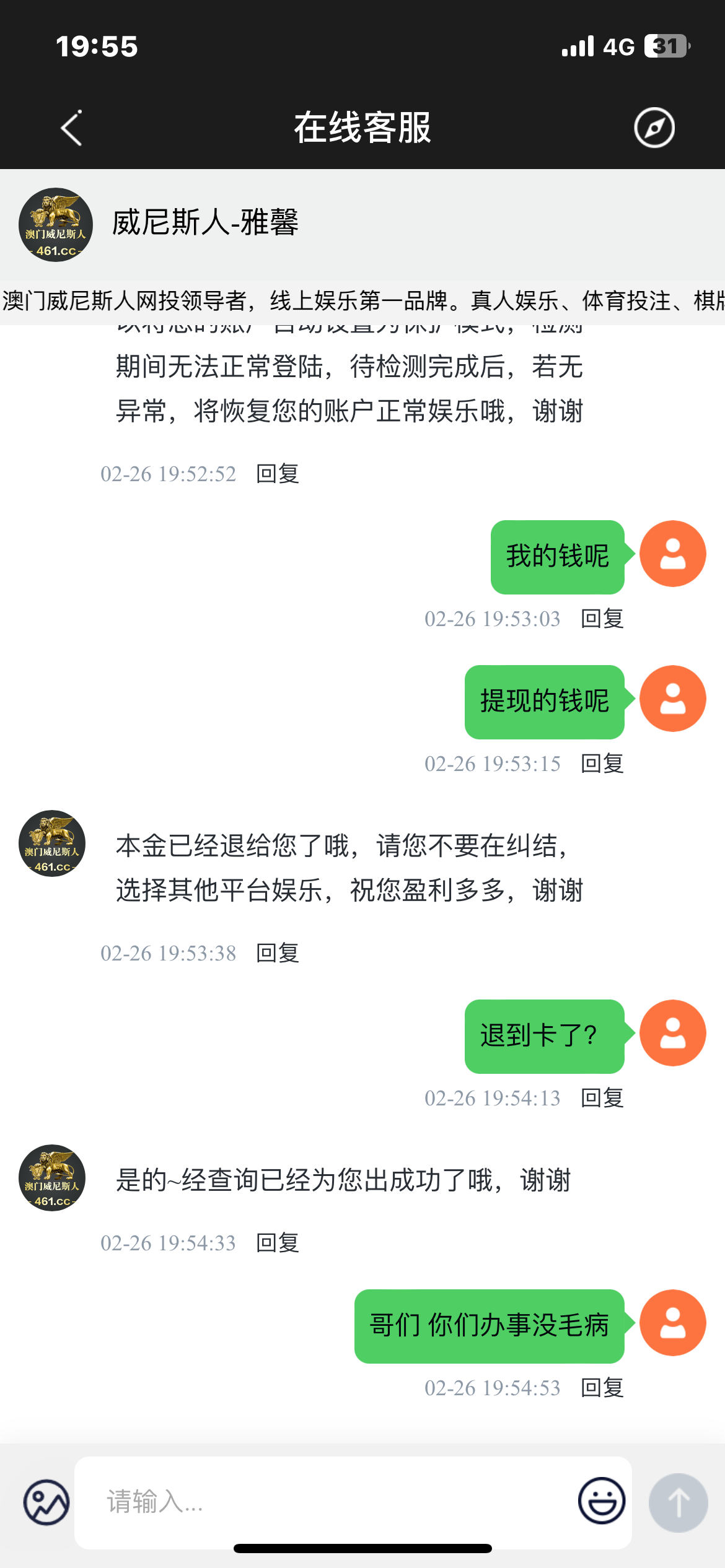 冲了一个50一个200 50输了 后面那个200赢到400 提现直接给我退回 问客服让我提本金