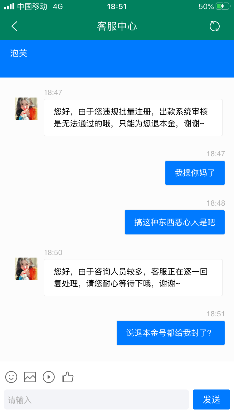 充80出500出款未通过说让找客服,客服说批量注册退本金,结果直接封号本金也不退,搞笑