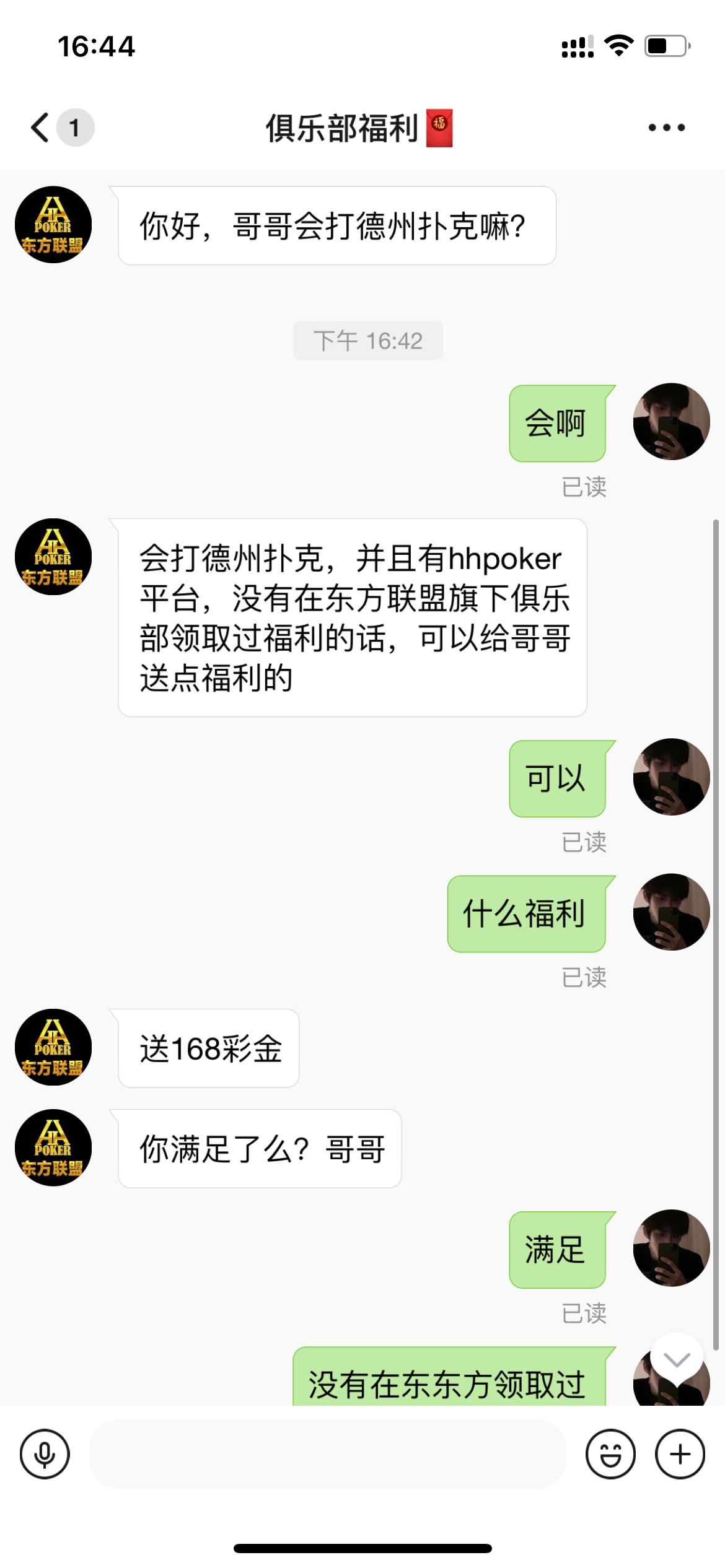 老板你好,德州扑克,德州牛仔,由于碰到薅羊毛大队,现联盟停止赠送168活动,开启首充200送168!要求简单!想参加可以联系我我推荐客服给您!
