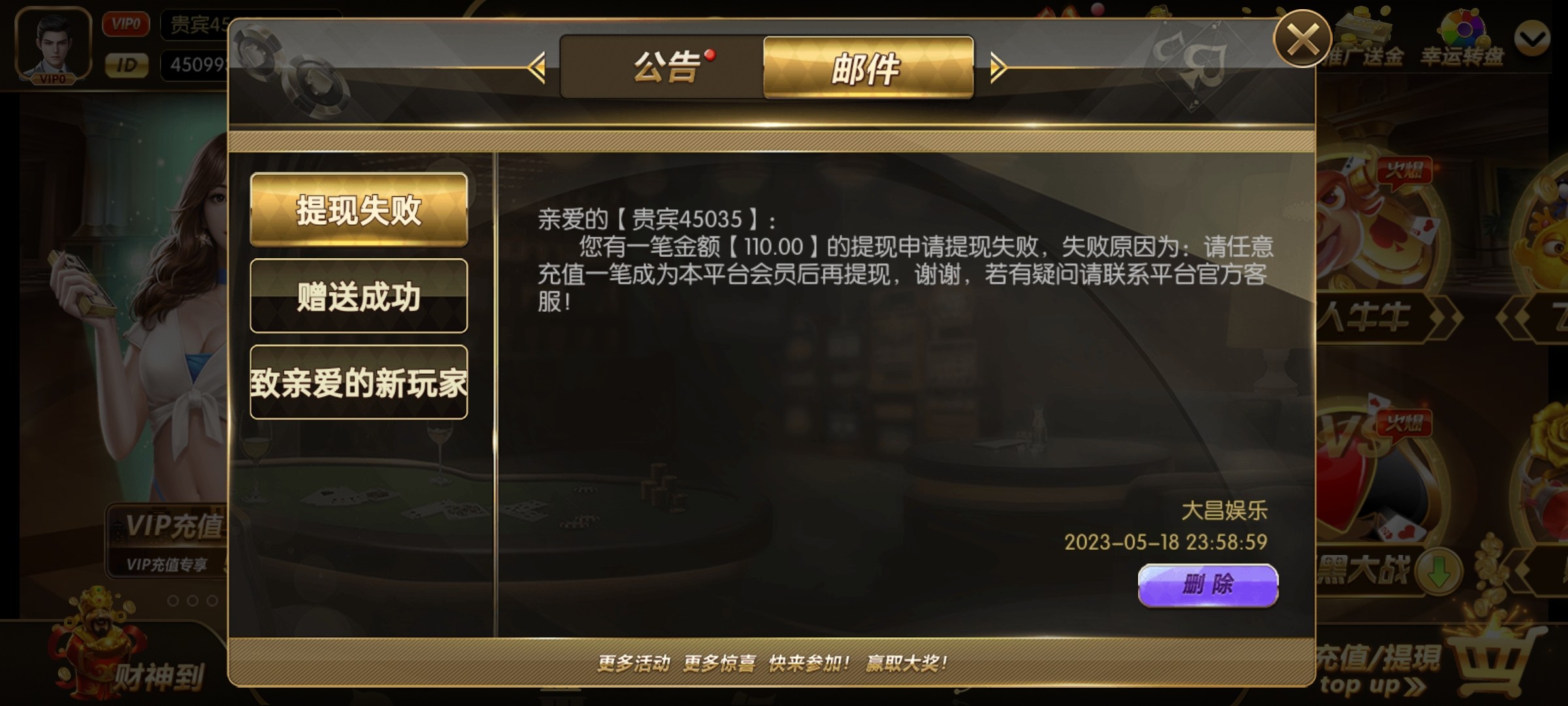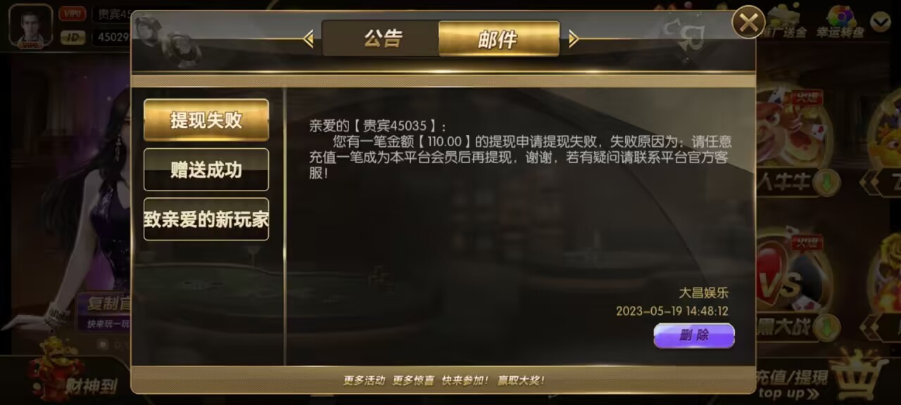 别去了,大昌g,提现充值,充值金额1倍水,赠送彩金3倍水,我打了500水,提现退回了,现在游戏的倍率已经调了,牛牛连续二十把无牛,你没看错全是无牛,牛一都没有